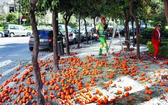Tidligere er vi blevet overrasket af vejret, og gaderne er blevet dynget til i de orange frugter, og det giver altså et værre oprydningsarbejde.