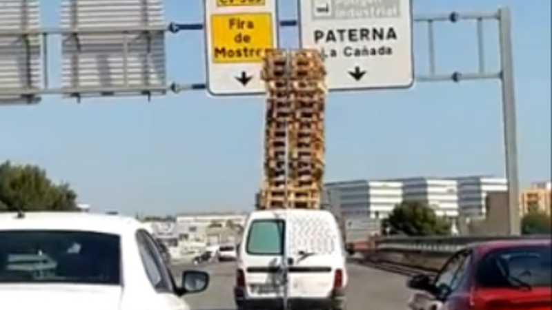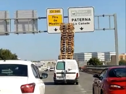Bilen kom kørende på CV-365 og kørte fra mod Fuente del Jarro de Paterna. Da den kører under vejskilte og broer, tror man, det er slut. men den kæmpe bunke paller sniger sig lige med nød og næppe under.