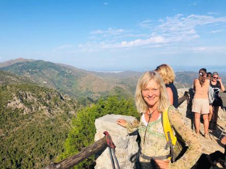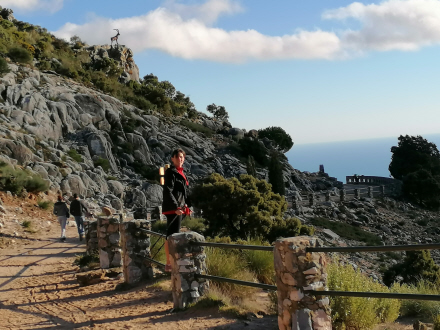 Efter en kort pause går vi tilbage gennem fyrretræerne op til udsigtspunktet El Corzo, hvorfra vi ser ud over Ojén, Mijas og Málaga.