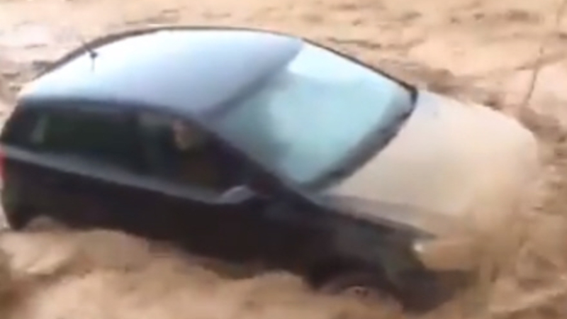 På den første video nederst i artiklen kan man se, hvordan de sidder fanget i deres bil, mens den langsomt bliver slugt og trukket med af vandmasserne.