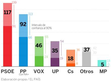 Sådan forudsiger El Pais mandatfordelingen. Den bygger på deres model for meningsmålinger og 15.000 simuleringer