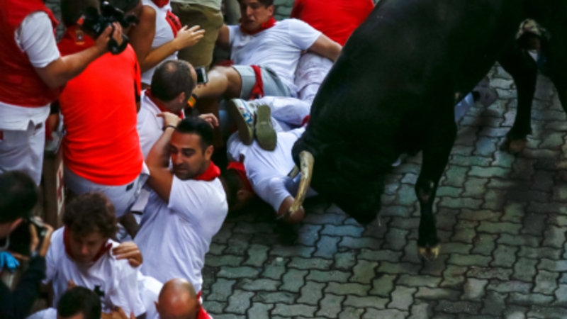 Derefter rev flere af tyrene sig løs fra flokken og gik efter enhver, der stod i deres vej. Nogle personer blev slynget op i luften, mens andre blev angrebet, efter de var faldet og lå på jorden. Du kan en video af løbet herunder.