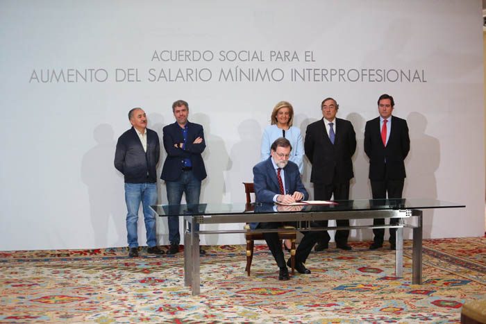 Det gjorde han sammen med beskæftigelsesministeren, Fátima Báñez, og generalsekretærerne for CCOO og UGT, Unai Sordo og Pepe Álvarez, samt de administrerende direktører, Juan Rosell og Cepyme, Antonio Garamendi.