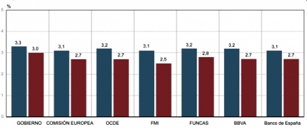 Som det fremgår af grafikken, deler hverken Verdensbanken, EU-kommissionen, OECD eller de anerkendte finansielle institutioner som BBVA, Spaniens Nationalbank eller Funcas Mariano Rajoys forudsigelser. De ligger alle væsentligt under