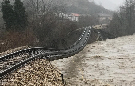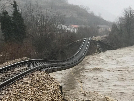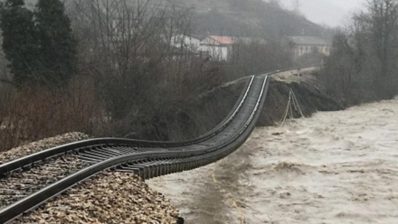 De oversvømmede togskinner er i La Casina, Serrapio i Asturien. Og floden under skinnerne er Río Aller.