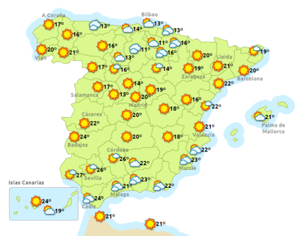 Nogle provinser kommer helt op i nærheden af 30, som der er tilfældet i Córdoba (29 grader) eller Badajóz (28), fortsat lidt køligt i syd, mens der ikke sker mange forandringer andre steder i landet.