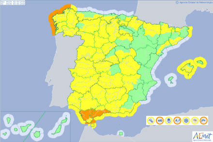 Nedbøren er vedholdende, lokalt tung og ledsaget af torden i de nordlige områder af Extremadura, det sydlige Andalusien, Galicien og den vestlige ende af Strædet.
