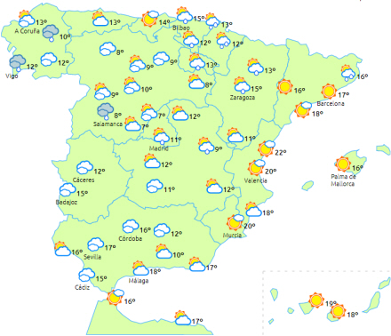 Faldende temperaturer i områderne langs den nordlige Atlanterhavskyst og i Girona. Svag frost i højtliggende områder på halvøen.