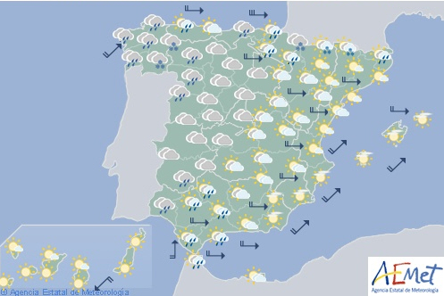 Stærke vindstød eller stærk vestenvind i den østlige ende af den nordlige Atlanterhavskyst, det østlige Castilla León og Castilla la Mancha, bjergområder i øst og sydøst, på Balearerne samt på den andalusiske østkyst.