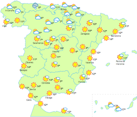 Faldende dagstemperaturer til den østlige halvdel af halvøen og på De Baleariske Øer. Nætterne bliver også køligere med udbredt frost i de indre egne - hård frost i bjergområderne på den nordlige halvdel. Stærk frost i Pyrenæerne, og svage til moderate frost i de nordlige og sydøstlige områder af halvøen.