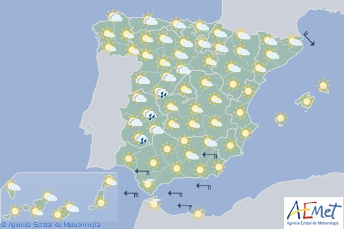 Stigende dagstemperaturer i Biscayabugten, den øvre Ebro-dal, det østlige Castilla y León og vestlige Aragon, mens de falder i Andalusien, men vi kan dog stadig komme over 34 grader i dalene Guadalquivir og Guadiana.