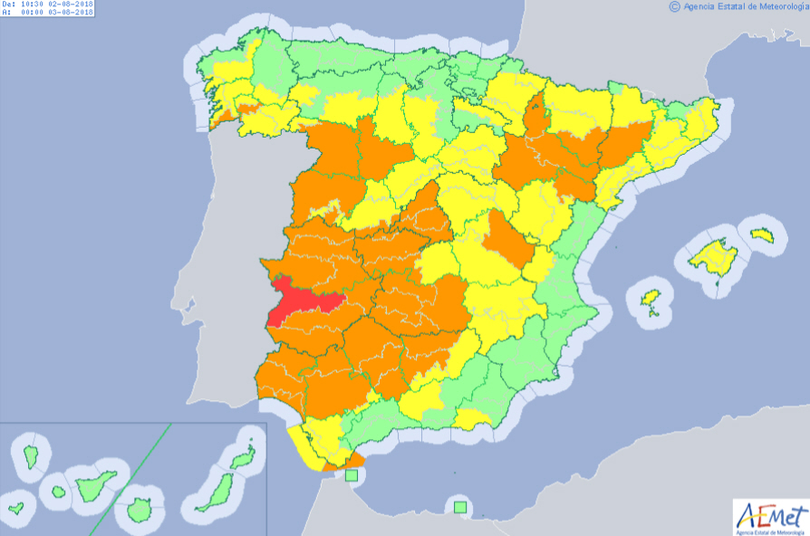 Særligt varmt bliver det i Extremadura, hvor der i en provins forventes op til 44 grader mellem klokken 14 og 21.