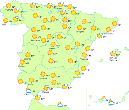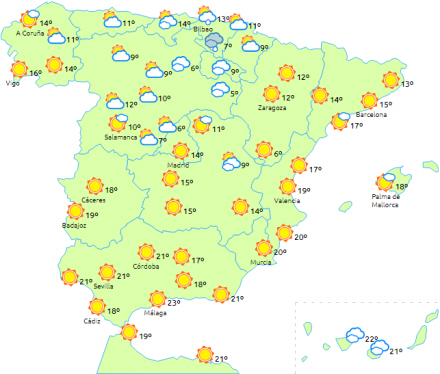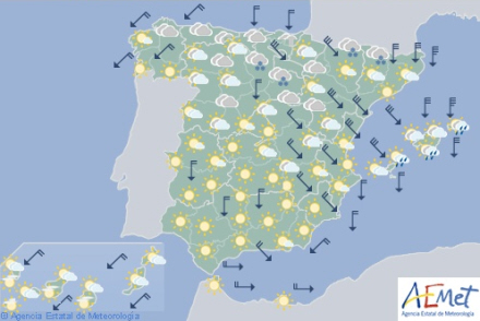 Skyet til overskyet med regn i Biscayabugten, det nordlige Navarra, den øvre Ebro-dal, Pyrenæerne og andre bjerge i nord - mest nedbør i Pyrenæerne i Lleida, som dog aftager i dagens anden halvdel.