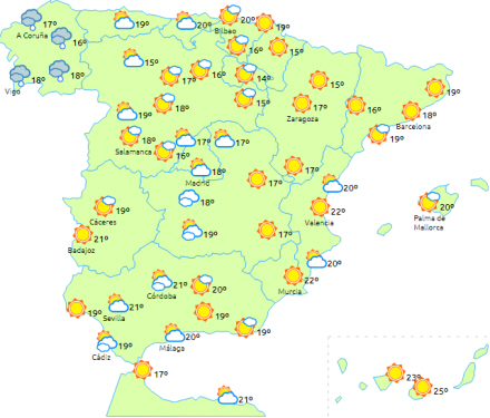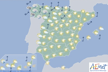 En atlanterhavsfront trækker ind over den nordvestlige del af halvøen. Det giver nedbør i Galicien, som lokalt kan være stærk eller vedholdende i vest - hovedsageligt fra middagstid.