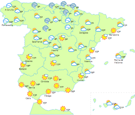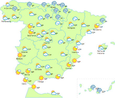 Skyet til overskyet med nedbør i Galiciens bjerge, den øvre Ebro-dal og Pyrenæerne. Lokalt tung og vedvarende nedbør på den cantabriske kyst. Nedbøren vil også påvirke resten af landets bjergområder, de indre egne og resten af Ebro-dalen, men i en svagere udgave, og det ser ud til at aftage i løbet af dagen.