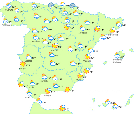Faldende dagstemperaturer på Balearerne og De Kanariske Øer, mens det også bliver en hel del køligere om natten på den sydlige halvdel af fastlandet. Ellers ikke de store ændringer.