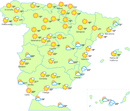Spredt nedbør forventes i nordvest og øvre Ebro-dal, men det har tendens til at høre op i løbet af dagen fra vest. Tungest nedbør på den nordøstlige del af halvøen, men det har også tendens til opklaring undtagen i Pyrenæerne.