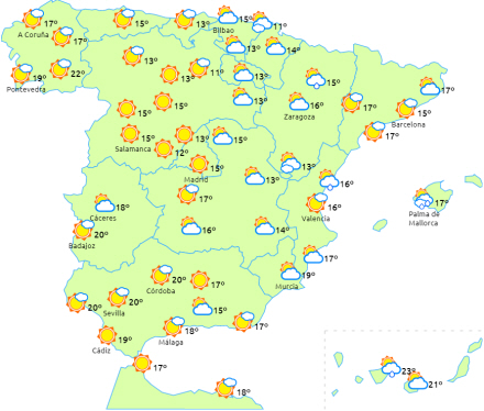 Lejlighedsvis nedbør ledsaget af torden. Lokalt tunge byger på De Baleariske Øer, hvor de vil i øvrigt blive hængende hele dagen. Der varsles også heldagsregn i Valencia Regionen, men de har dog tendens til at aftage i dagens anden halvdel.