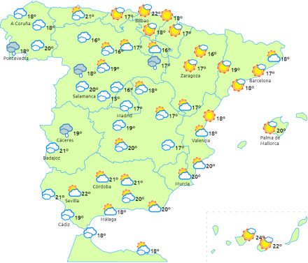 På De Baleariske Øer perioder med mellem- og højtliggende skyer, mens der overvejende er letskyet på De Kanariske Øer.