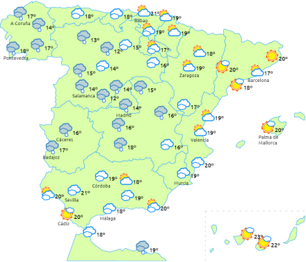 På resten af halvøen er der perioder med letskyet himmel, men i løbet af dagen flere skyer i de indre områder, hvilket giver regn og lejlighedsvise tordenbyger i Pyrenæerne, De Iberiske Randbjerge og i den cantabriske bjergkæde, men det kan også komme til at dryppe i nærliggende områder og i bjergene i de indre egne.