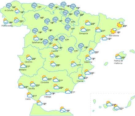 Atlanterhavsfronten, der begyndte at trække ind fra vest i går ventes i dag at fortsætte med at bevæge sig østover, og det giver overskyet himmel med nedbør til aller vestligte af halvøen, som så efterhånden sprede sig til resten af den vestlige halvdel af fastlandet, Andalusien, Strædet og Melilla.