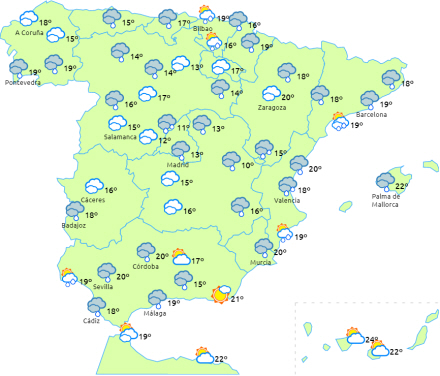 I dag forventes overskyet himmel over en stor del af halvøen og De Baleariske Øer med udbredte regn- og tordenbyger.