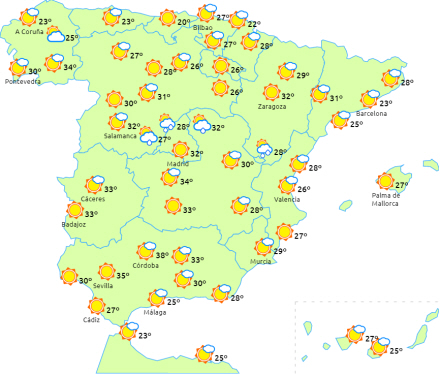 Faldende dagstemperaturer i det indre af halvøens østlige halvdel og stigende i den østlige ende af de nordvestlige kystområder. De forbliver markant høje på De Kanariske Øer og det sydvestlige af halvøen, hvor vi kan ramme 34 grader, mens den kan komme helt op og kysse 36 i Guadalquivir-dalen. Stigende nattemperaturer i den nordlige halvdel.