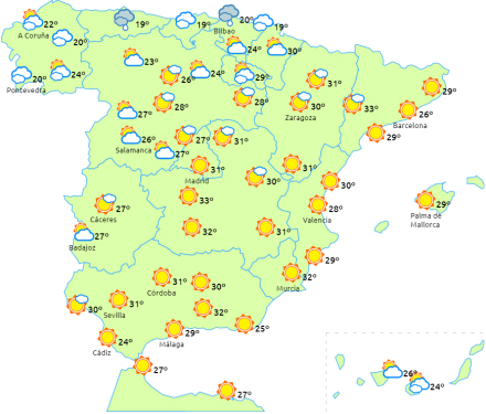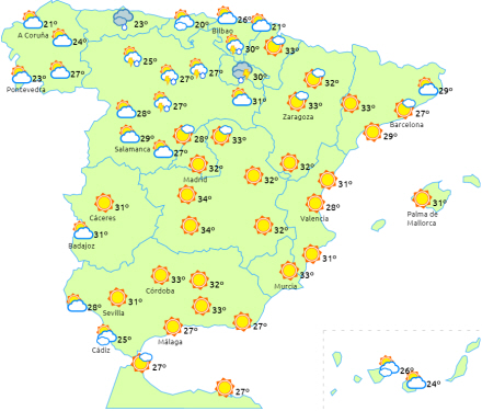 Faldende temperaturer til den vestlige halvdel af fastlandet og få ændringer i resten. Vi kommer over 34 grader i dalene Ebro, Tagus, Guadiana og Guadalquivir. Om natten kommer vi fortsat over 20 grader i de samme områder samt ved Middelhavskysten.