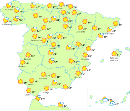Lokalt mærkbart stigende dagstemperaturer i nordvest og Ebro-dalen og uden større ændringer i resten. Vi kommer over 38 grader i de sydlige Atlanterhavsområder og i dalene Duero og Ebro, mens vi kan komme over 40 grader i Guadalquivir. Vi kommer ikke under 20 grader på noget tidfspunkt af døgnet i de indre egne af halvøens sydvestlige områder samt i Ebro-dalen og langs Middelhavskysten.