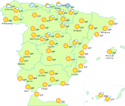 Der varsles meget høje temperaturer i Ebro-dalen, de indre egne i syd og i midten af halvøen samt på De Kanariske Øer.