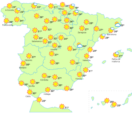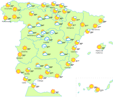 Vi forventer at komme over 40 til 42 grader i Guadalquivir-dalen, 40 i dalene Tagus og Guadiana og 34 til 36 i resten af den sydlige halvdel af halvøens indre egne, de indre egne i nord og på De Kanariske Øer.
