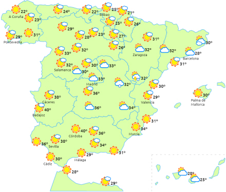 Faldende dagstemperaturer til den nordlige tredjedel af halvøen og ellers få ændringer eller lette stigninger i resten. Vi rammer unormalt høje temperaturer i områder i Galicien, Extremadura og på Gran Canaria. Vi kommer over 36 grader på i de sydlige Atlanterhavsområder og over 38 i Guadalquivir, Guadiana og Tagus.