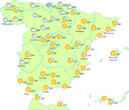 Men der varsles også høje temperaturer til Baskerlandet, Ebro-dalen, Castilla-La Mancha, De Baleariske Øer, Andalusien, La Rioja, Navarra, Aragón og Catalonien.