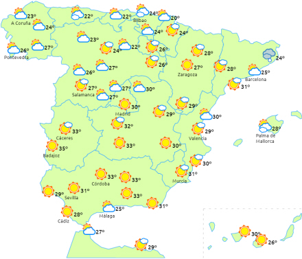 Faldende dagstemperaturer til den østlige tredjedel af halvøen, Andalusien, Balearerne og De Kanariske Øer, mens de stiger på resten af halvøen. Selvom vi generelt opretholder normale værdier, kan vi sandsynligvis overstige 36 grader i de sydvestlige egne af halvøen.