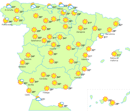 Der varsles også høje temperaturer på Balearerne og områder af den sydlige halvdel samt den østlige tredjedel af halvøen.