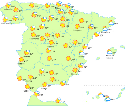 Faldende temperaturer i dagtimerne i det helt nordlige af halvøen og Ebro-dalen, mens de er stigende på De Kanariske Øer og langs halvøens sydlige Middelhavsområder.