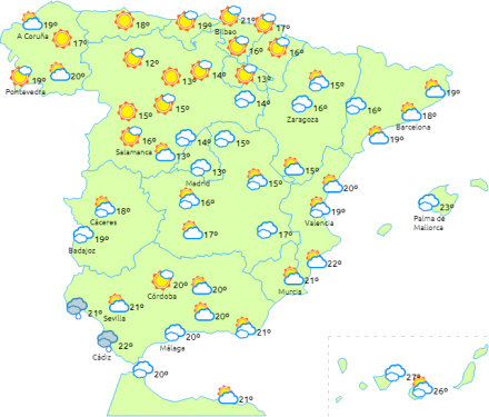 Der forventes som nævnt tåge mange steder med lavthængende skyer i dalene Ebro og Duero, det indre af halvøens sydøstlige egne og i mindre grad også i den vestlige del af Andalusien og på Mallorca.