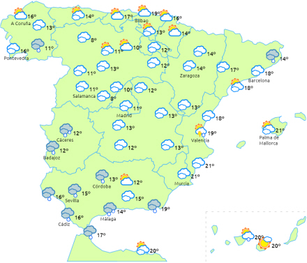 Således forventes skyet eller overskyet himmel i Galicien med nedbør, der kan være vedvarende og som i løbet af dagen breder til resten af den vestlige halvdel af fastlandet og de nordlige egne af De Kanariske Øer.
