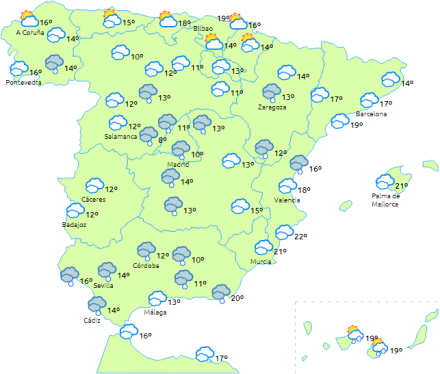 Der forventes skyet eller overskyet himmel over hele landet og lokal stærk eller vedvarende nedbør som nævnt i starten af denne artikel. Der forventes dog ingen nævneværdig nedbør ved nordvestkysten eller på De Baleariske Øer.