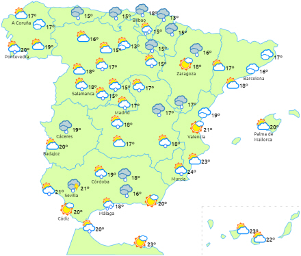 Faldende temperaturer i dagtimerne i den nordlige del af Galicien, nordvestkysten og på De Baleariske Øer, mens de stiger i Aragon og Levante-området og ellers få ændringer i resten. Natten sker der heller ikke meget med.