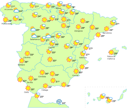 Letskyet eller klar himmel i det meste af landet. Der er dog overskyet med nedbør i det meste af det østlige og nordlige Cantabrien i Navarra, der dog klarer op om eftermiddagen. Det vil også være overskyet i resten af af Pyrenæerne og det helt nordøstlige af Catalonien, og det udløser nogle byger om eftermiddagen.