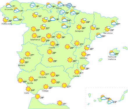 Tørt og stabilt vejr til det meste af landet med letskyet eller klar himmel, undtagen i Kantabrien og det nordvestlige Navarra, hvor der forventes overskyet himmel med svage, spredte og lejlighedsvise byger.