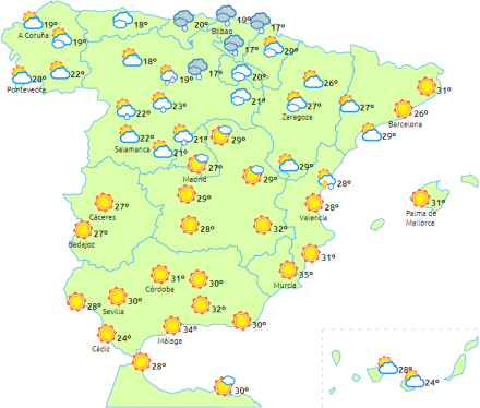 Et højtryk forventes at give tørt og stabilt vejr til en stor del af landet med letskyet eller klart vejr. I den nordlige halvdel af Galicien og det østlige af nordvestkysten forventes der dog overskyet vejr med byger, som i løbet af eftermiddagen vil aftage ved kysten og brede sig til resten af Galicien og nordvestkysten i form af byger.