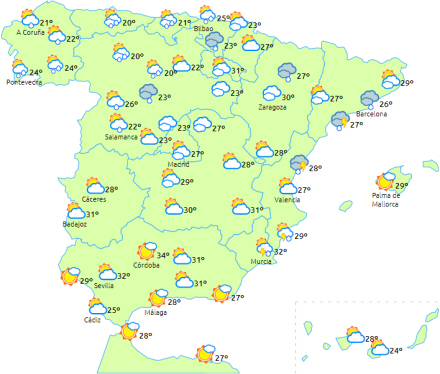 På grund af en Atlanterhavsfront, der nærmer sig, vil der være overskyet i perioder og sandsynlighed for svag og spredt nedbør generelt i Galicien og ved nordvestkysten. Skyet til overskyet himmel over resten af den nordlige og østlige halvdel af halvøen og Balearerne med mulighed for byger eller torden, som vil være mere sandsynlige og intense i og omkring bjergområderne i den østlige tredjedel af halvøen.