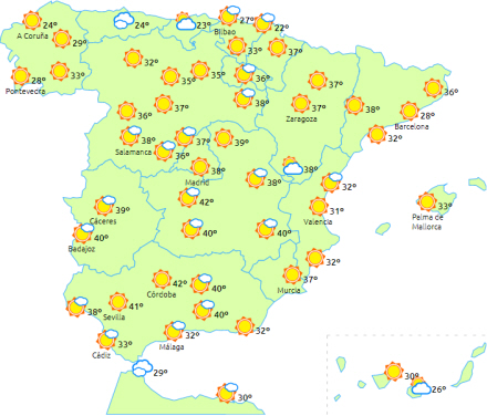 Advarsler om meget høje temperaturer i det meste af halvøens indre egne og på Balearerne.