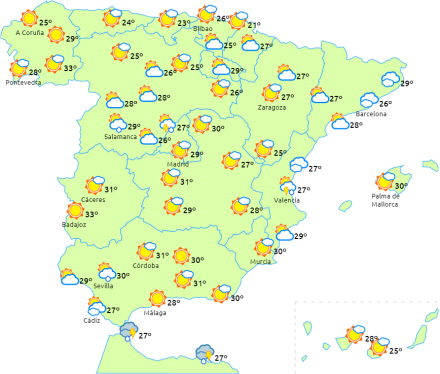 Det meste af landet nyder fortsat godt af et højtryk, der giver tørt og solrigt vejr med letskyet himmel. I store dele af de centrale, østlige og sydlige dele af halvøen, Balearerne og Gibraltarstrædet vil situationen dog fortsat være moderat ustabil med mellem- og højliggende skyer og tiltagende skydække i løbet af dagtimerne.