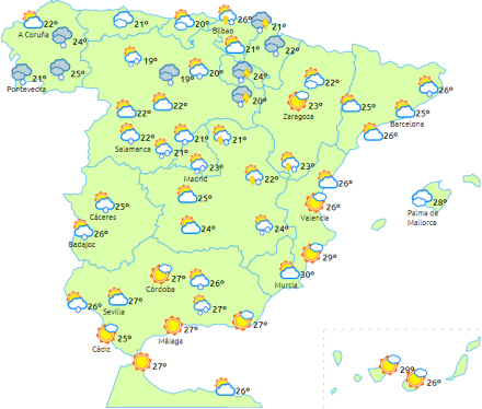 Temperaturerne falder i Galicien, i de indre egne fra nord til syd og i det østlige Catalonien. Kun få ændringer i resten.