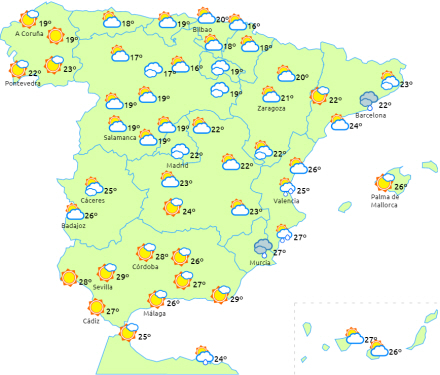 Der forventes stabilt vejr til det meste af halvøen med letskyet himmel eller højtliggende skylag. På halvøens østkyst og på Balearerne vil der dog være overskyet vejr, og der forventes byger.