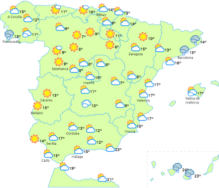 Dagstemperaturerne har tendens til at stige på halvøen og Balearerne, undtagen i Cantabrien, hvor de vil falde en smule. Dagstemperaturerne har også tendens til at falde på De Kanariske Øer, især i de centrale dele.