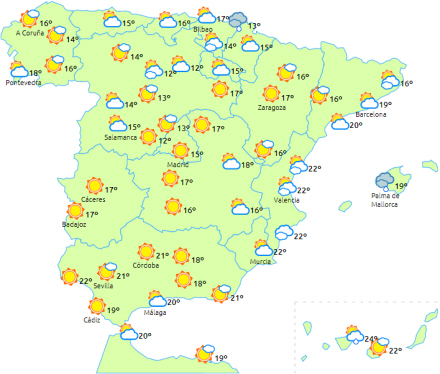 Dagstemperaturerne stiger i den nordøstlige del af Catalonien, mens natten bliver lunere i de centrale og nordlige dele af halvøen. Kun få ændringer andre steder. Svag frost i Pyrenæerne, De Iberiske Randbjerge og de indre egne i nord.